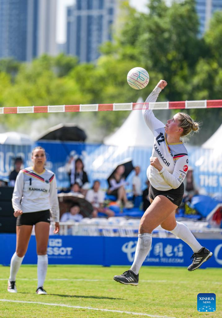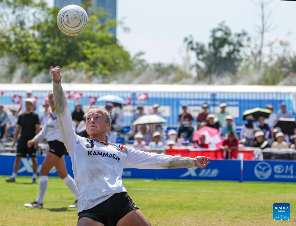 Jordan Nadermann (R) of Germany competes during the Fistball Women's Semifinal Match between Germany and Switzerland at The World Games 2025 in Chengdu, southwest China's Sichuan Province, Aug. 12, 2025. (Xinhua/Tenzin Nyida)