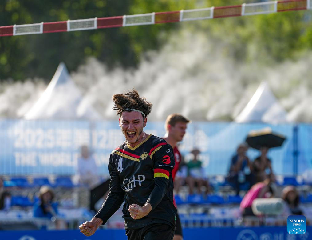 Johannes Jungclaussen of Germany celebrates during the Fistball Men's Semifinal Match between Germany and Austria at The World Games 2025 in Chengdu, southwest China's Sichuan Province, Aug. 12, 2025. (Xinhua/Tenzin Nyida)