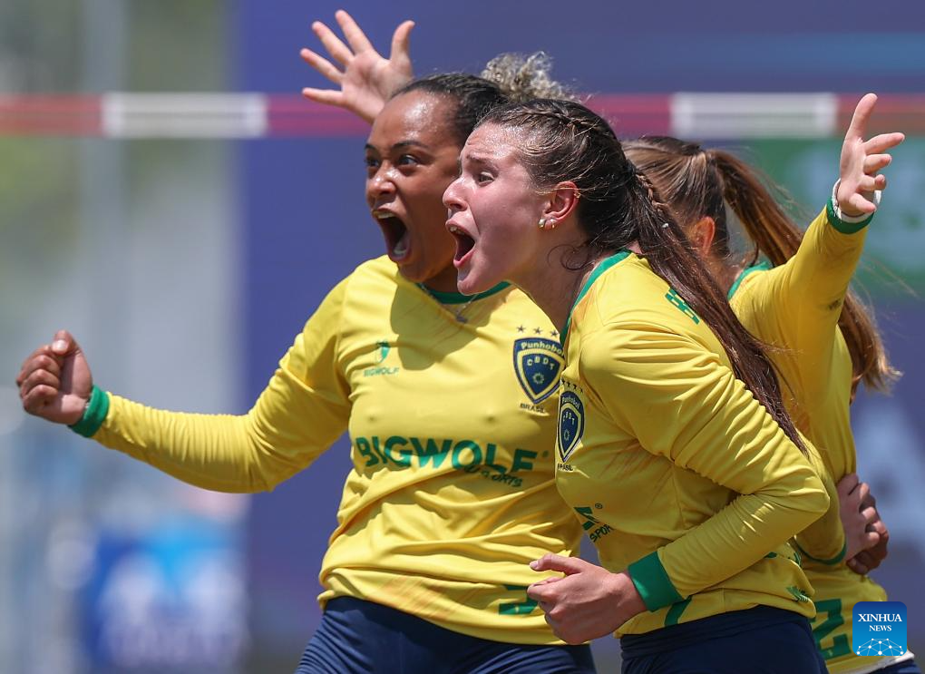 Players of Brazil celebrate during the Fistball Women's Semifinal Match between Brazil and Austria at The World Games 2025 in Chengdu, southwest China's Sichuan Province, Aug. 12, 2025. (Xinhua/Chen Cheng)