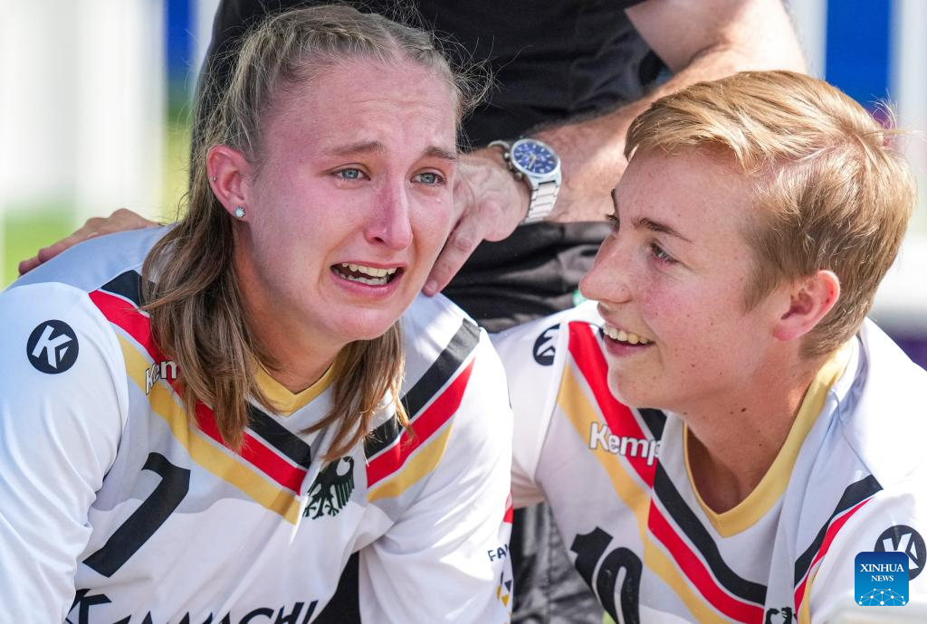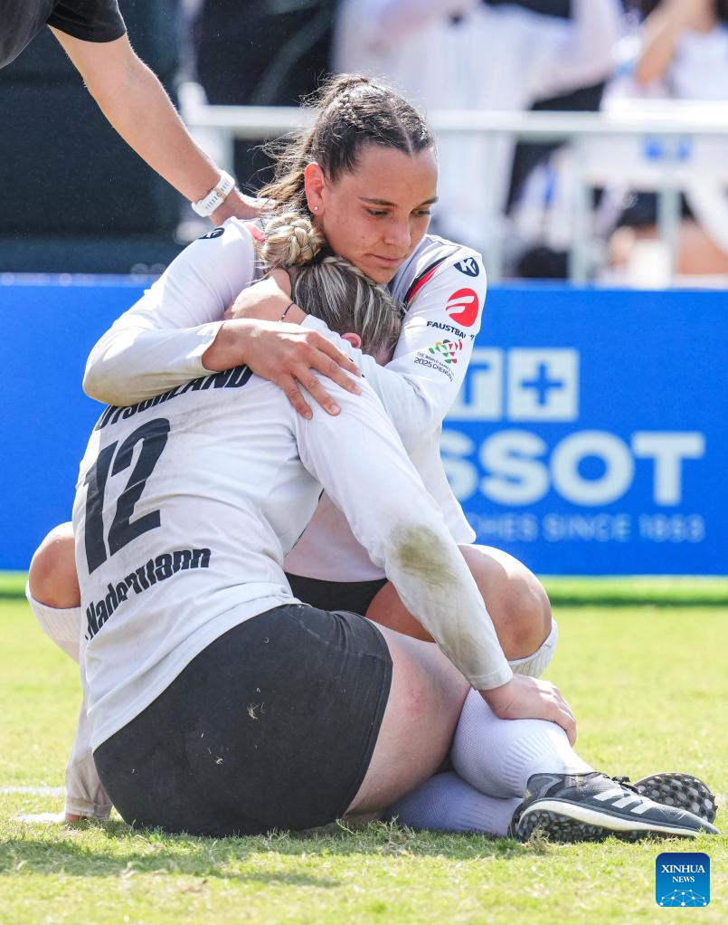 Svenja Schroder (L) of Germany sheds tears after the Fistball Women's Semifinal Match between Germany and Switzerland at The World Games 2025 in Chengdu, southwest China's Sichuan Province, Aug. 12, 2025. (Xinhua/Tenzin Nyida)