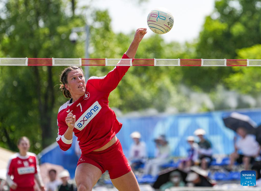 Tanja Bognar of Switzerland competes during the Fistball Women's Semifinal Match between Germany and Switzerland at The World Games 2025 in Chengdu, southwest China's Sichuan Province, Aug. 12, 2025. (Xinhua/Tenzin Nyida)