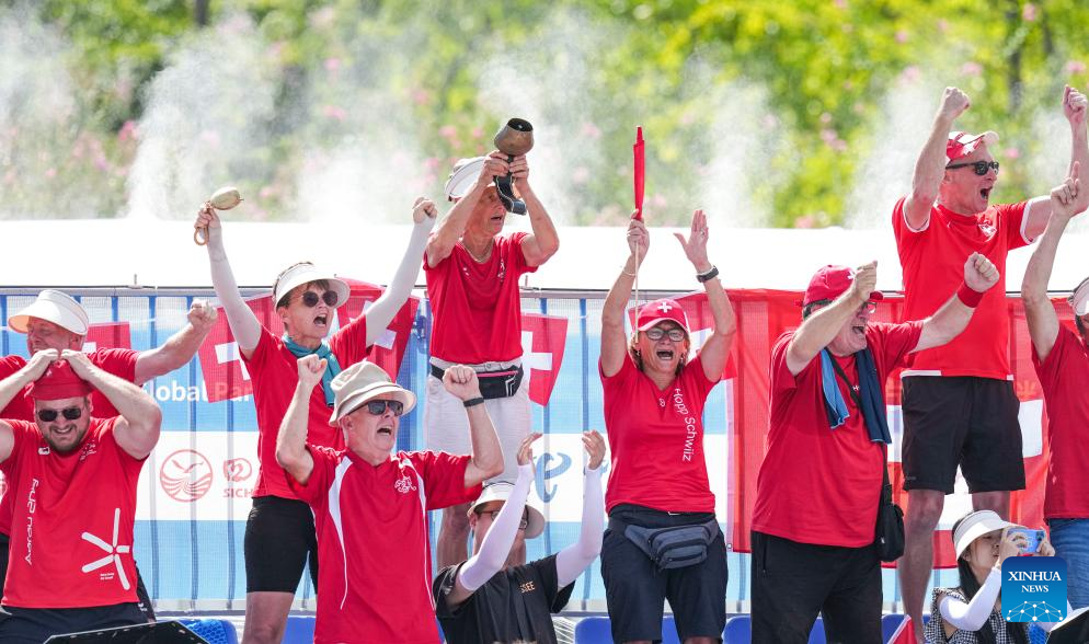 Fans of Switzerland cheer for the team after the Fistball Women's Semifinal Match between Germany and Switzerland at The World Games 2025 in Chengdu, southwest China's Sichuan Province, Aug. 12, 2025. (Xinhua/Tenzin Nyida)