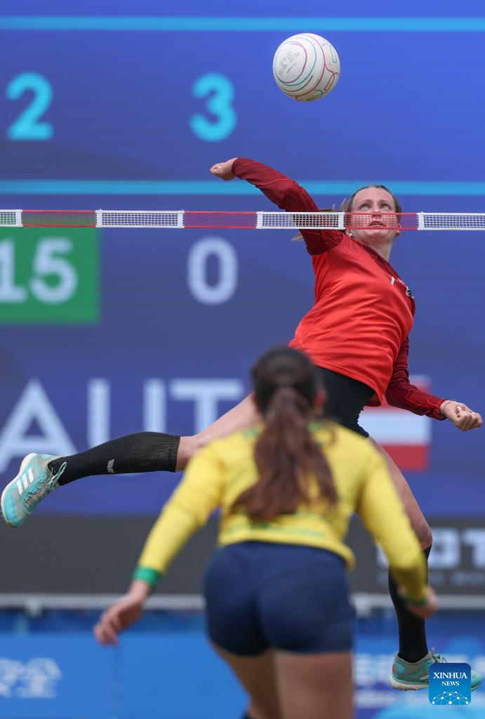 Alina Rudlstorfer (top) of Austria competes during the Fistball Women's Semifinal Match between Brazil and Austria at The World Games 2025 in Chengdu, southwest China's Sichuan Province, Aug. 12, 2025. (Xinhua/Chen Cheng)