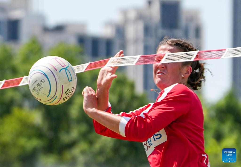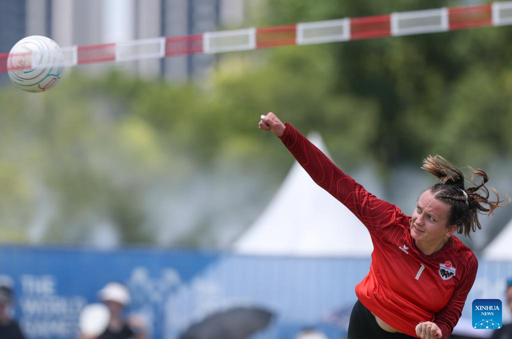Jana Pinsker of Austria competes during the Fistball Women's Semifinal Match between Brazil and Austria at The World Games 2025 in Chengdu, southwest China's Sichuan Province, Aug. 12, 2025. (Xinhua/Chen Cheng)