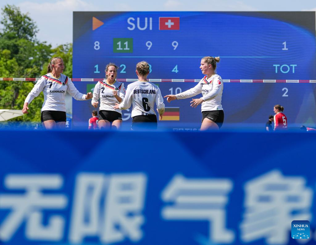 Players of Germany celebrate scoring during the Fistball Women's Semifinal Match between Germany and Switzerland at The World Games 2025 in Chengdu, southwest China's Sichuan Province, Aug. 12, 2025. (Xinhua/Tenzin Nyida)