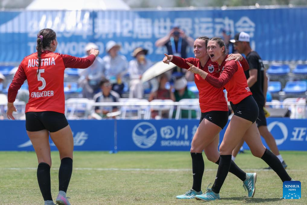 Players of Austria celebrate scoring during the Fistball Women's Semifinal Match between Brazil and Austria at The World Games 2025 in Chengdu, southwest China's Sichuan Province, Aug. 12, 2025. (Xinhua/Chen Cheng)