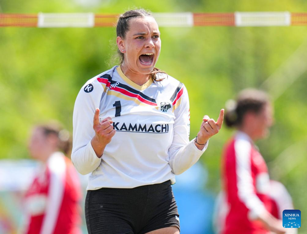 Michaela Grzywatz of Germany competes during the Fistball Women's Semifinal Match between Germany and Switzerland at The World Games 2025 in Chengdu, southwest China's Sichuan Province, Aug. 12, 2025. (Xinhua/Tenzin Nyida)