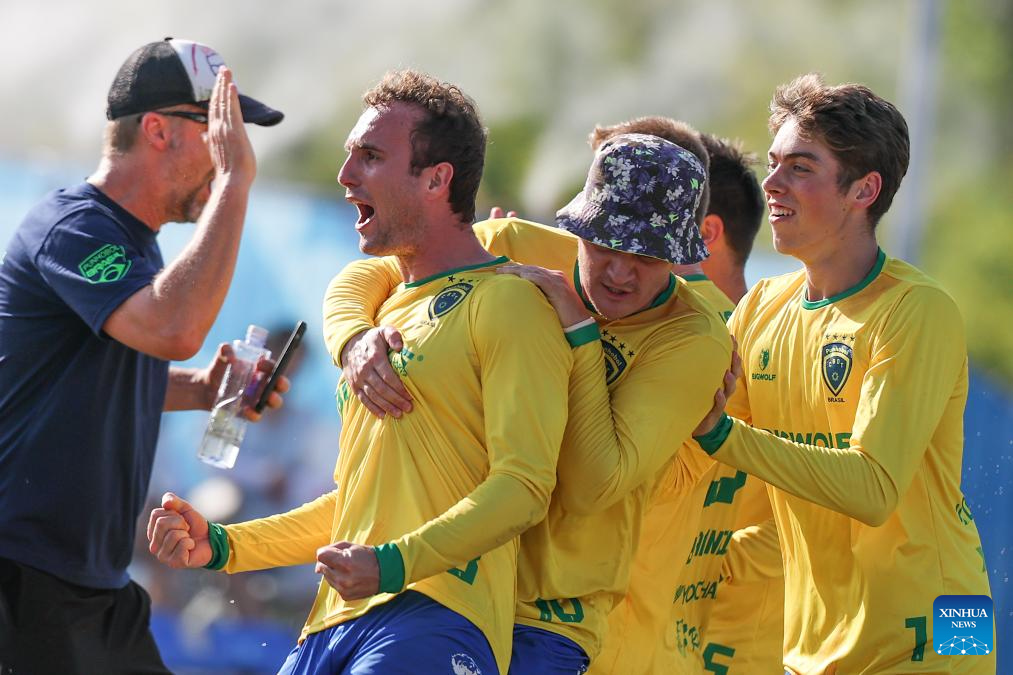 Players of Brazil celebrate after the Fistball Men's Semifinal Match between Brazil and Switzerland at The World Games 2025 in Chengdu, southwest China's Sichuan Province, Aug. 12, 2025. (Xinhua/Chen Cheng)