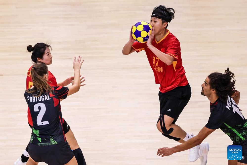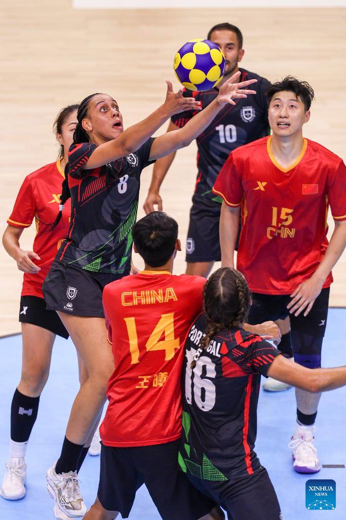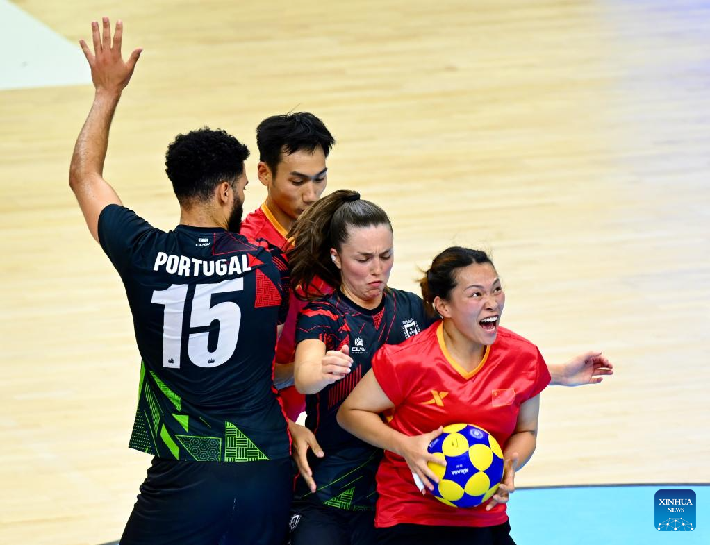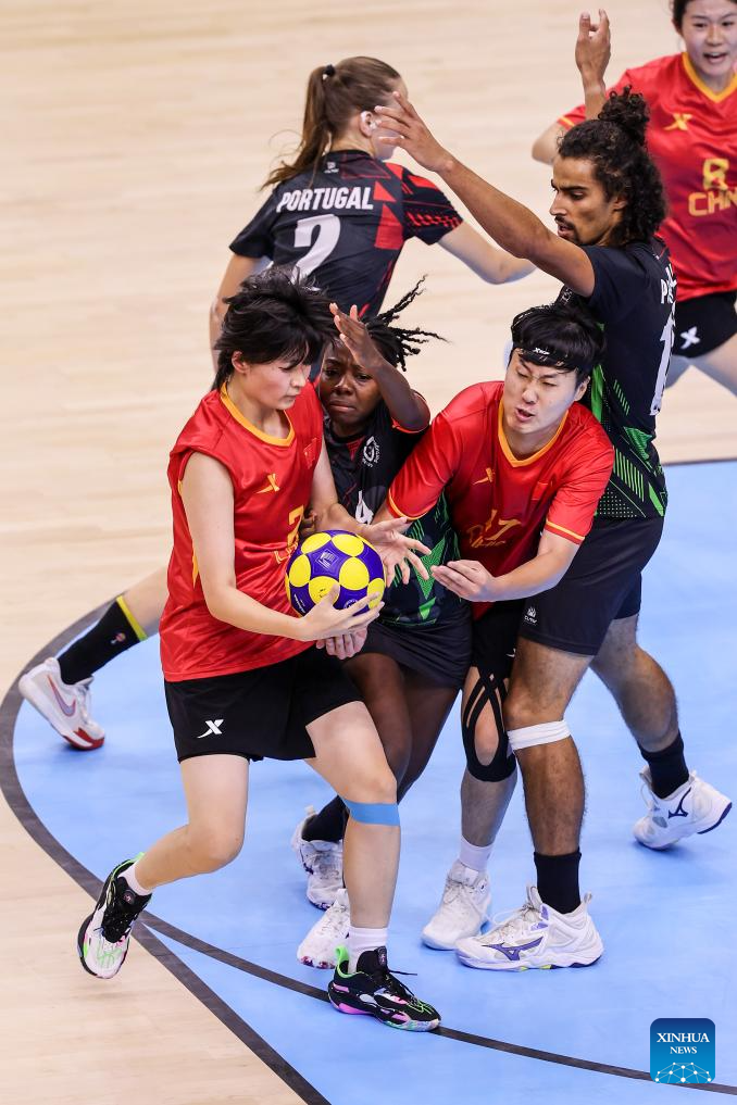 Beatriz Rosa (2nd L) of Portugal competes during the Mixed Team Finals 7th Place Game between China and Portugal of Korfball event at The World Games 2025 in Chengdu, southwest China's Sichuan Province, Aug. 12, 2025. (Xinhua/Li Bo)
