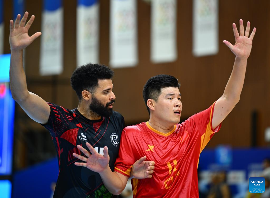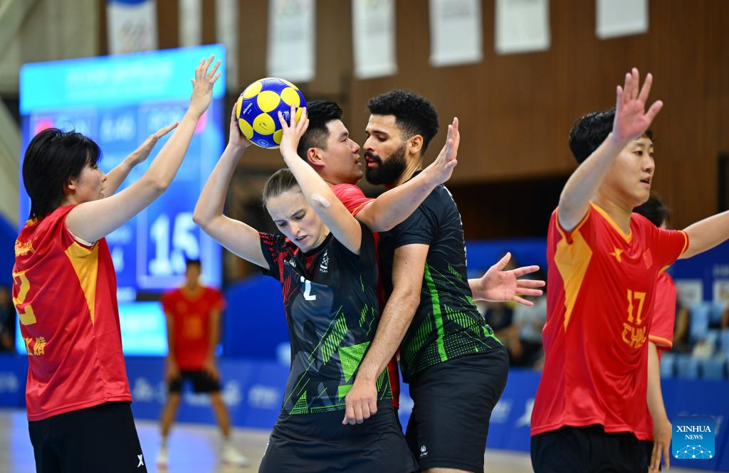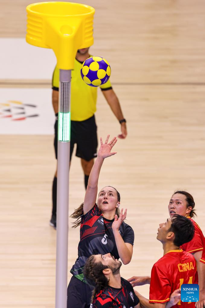 Xiao Fei (2nd R) of China competes during the Mixed Team Finals 7th Place Game between China and Portugal of Korfball event at The World Games 2025 in Chengdu, southwest China's Sichuan Province, Aug. 12, 2025. (Xinhua/Li Bo)