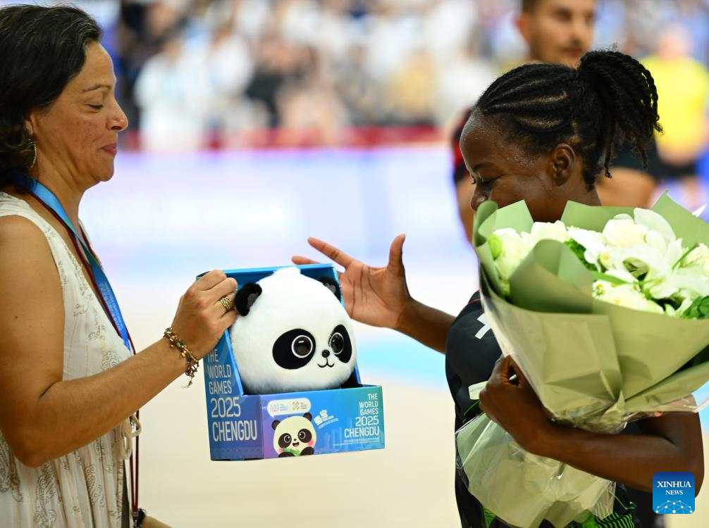 Luise Costa Ruivo (R) of Portugal receives a gift after the Mixed Team Finals 7th Place Game between China and Portugal of Korfball event at The World Games 2025 in Chengdu, southwest China's Sichuan Province, Aug. 12, 2025. (Xinhua/Jiang Kehong)