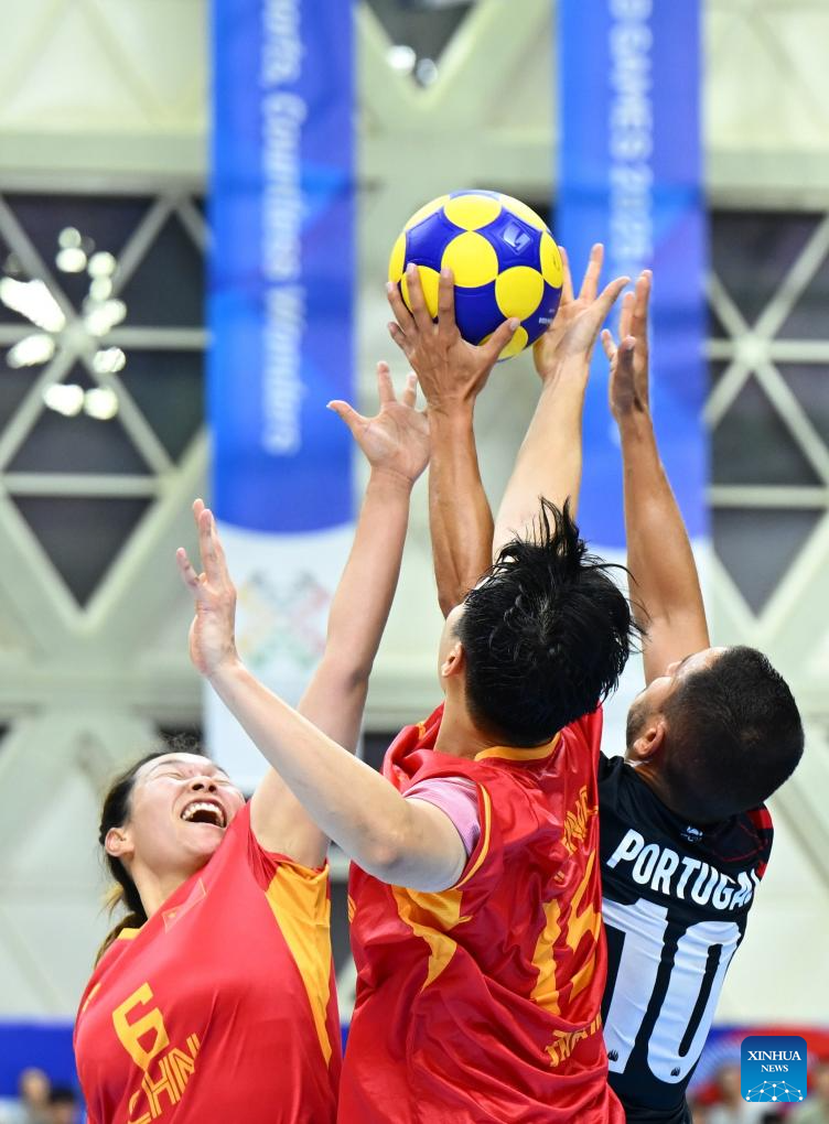 Fu Yuran (L) and Sun Jingyuan (C) of China vie with Tiago Luz of Portugal during the Mixed Team Finals 7th Place Game of Korfball event at The World Games 2025 in Chengdu, southwest China's Sichuan Province, Aug. 12, 2025. (Xinhua/Jiang Kehong)