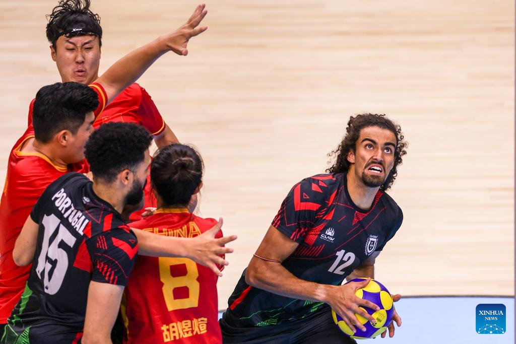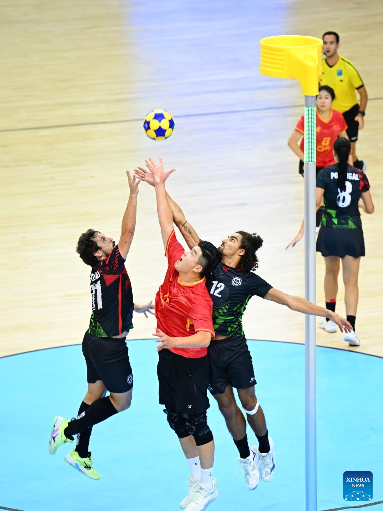 Afonso Lourenco (1st R) of Portugal competes during the Mixed Team Finals 7th Place Game between China and Portugal of Korfball event at The World Games 2025 in Chengdu, southwest China's Sichuan Province, Aug. 12, 2025. (Xinhua/Li Bo)