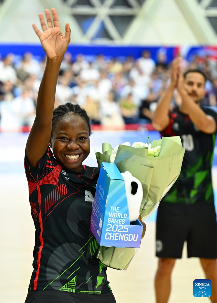 Luise Costa Ruivo (L) of Portugal greets the spectators after the Mixed Team Finals 7th Place Game between China and Portugal of Korfball event at The World Games 2025 in Chengdu, southwest China's Sichuan Province, Aug. 12, 2025. (Xinhua/Jiang Kehong)