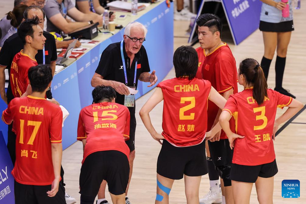 China's Assistant coach Bernard Crum (C top) gives instructions during the Mixed Team Finals 7th Place Game between China and Portugal of Korfball event at The World Games 2025 in Chengdu, southwest China's Sichuan Province, Aug. 12, 2025. (Xinhua/Li Bo)