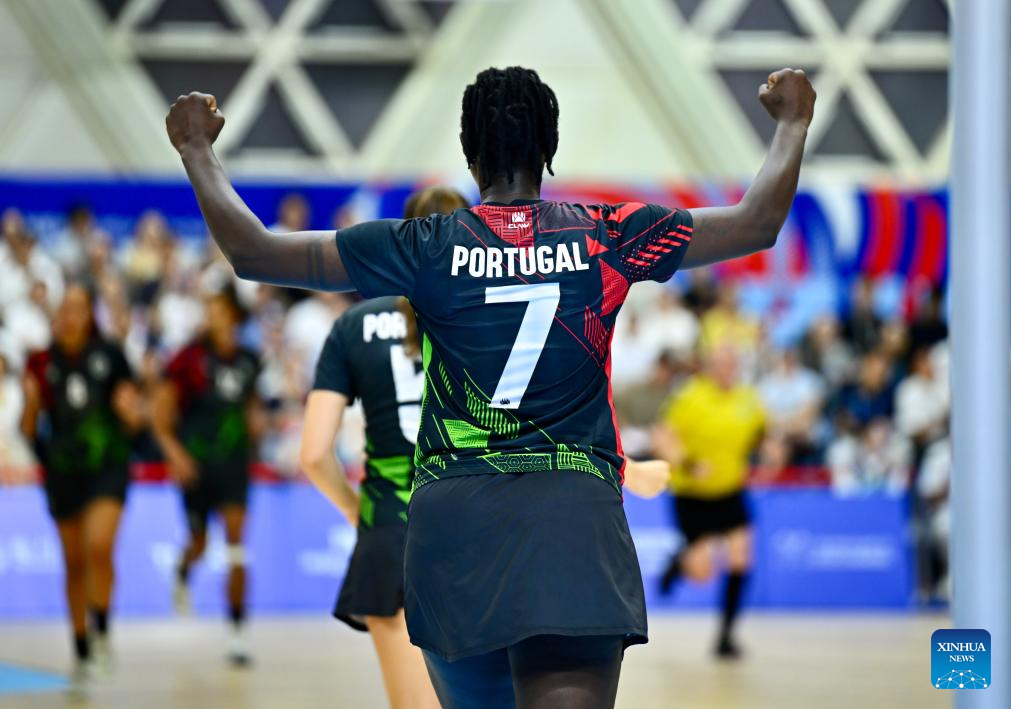 Catarina Correia of Portugal celebrates during the Mixed Team Finals 7th Place Game between China and Portugal of Korfball event at The World Games 2025 in Chengdu, southwest China's Sichuan Province, Aug. 12, 2025. (Xinhua/Jiang Kehong)