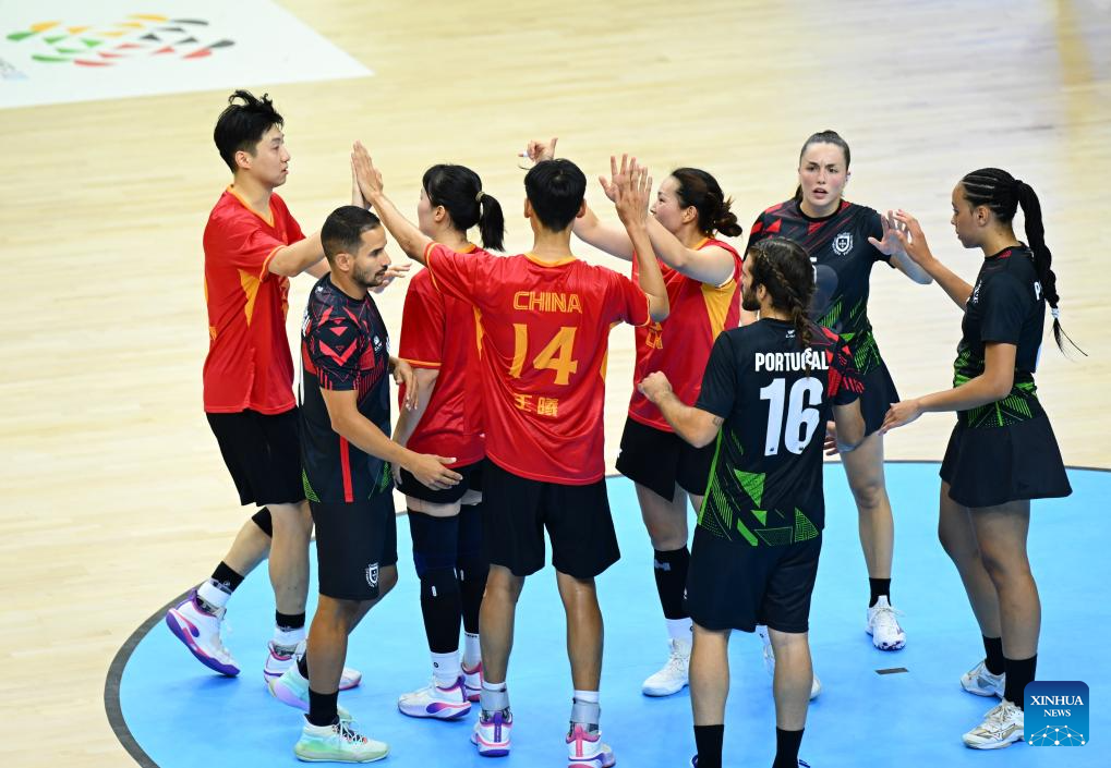 Players compete during the Mixed Team Finals 7th Place Game between China and Portugal of Korfball event at The World Games 2025 in Chengdu, southwest China's Sichuan Province, Aug. 12, 2025. (Xinhua/Jiang Kehong)