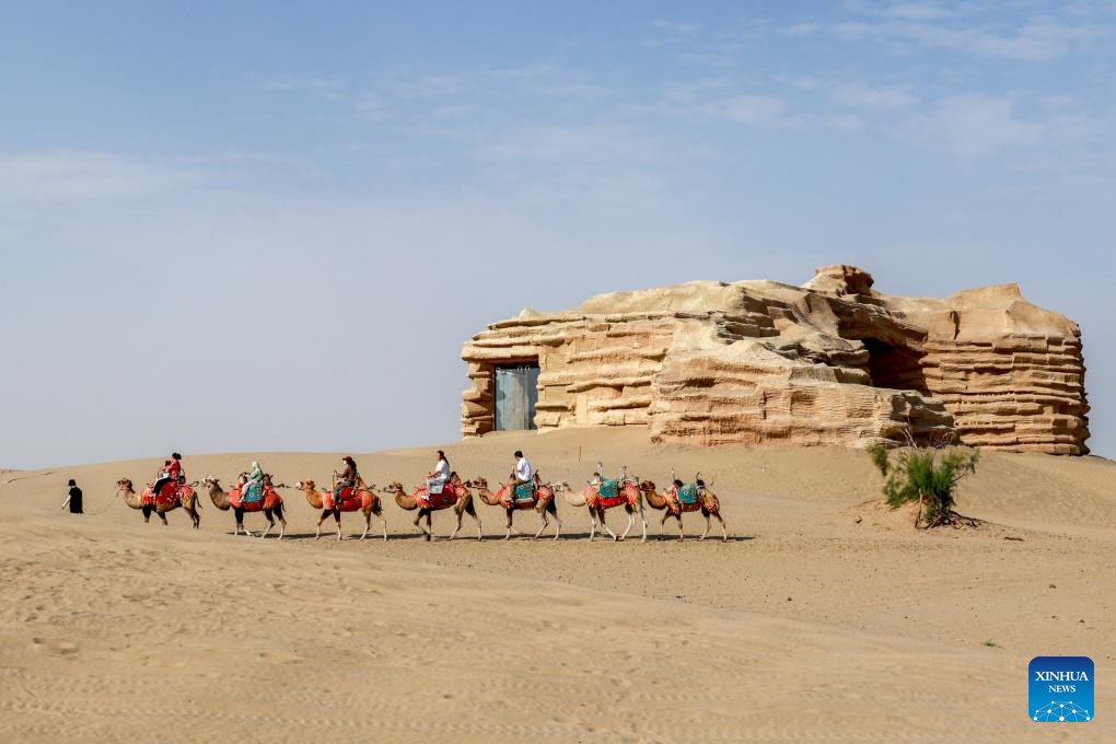 Tourists ride camels at the "desert gate" scenic area in Alaer, northwest China's Xinjiang Uygur Autonomous Region, Aug. 12, 2025. The "desert gate" scenic area, covering an area of 14 hectares, receives an average of 600,000 visits annually. (Xinhua/Liu Jiaqi)