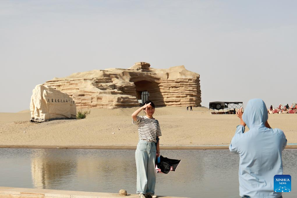 Tourists take photos at the "desert gate" scenic area in Alaer, northwest China's Xinjiang Uygur Autonomous Region, Aug. 12, 2025. The "desert gate" scenic area, covering an area of 14 hectares, receives an average of 600,000 visits annually. (Xinhua/Liu Jiaqi)