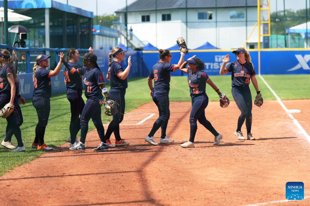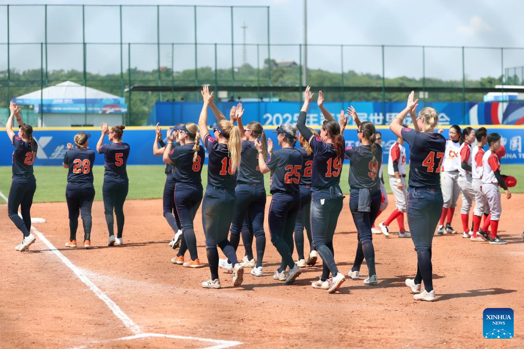 Players of the Netherlands celebrate after the Softball Women's Preliminary Round Group A Match between China and the Netherlands at The World Games 2025 in Chengdu, southwest China's Sichuan Province, Aug. 13, 2025. (Xinhua/Jiang Kehong)