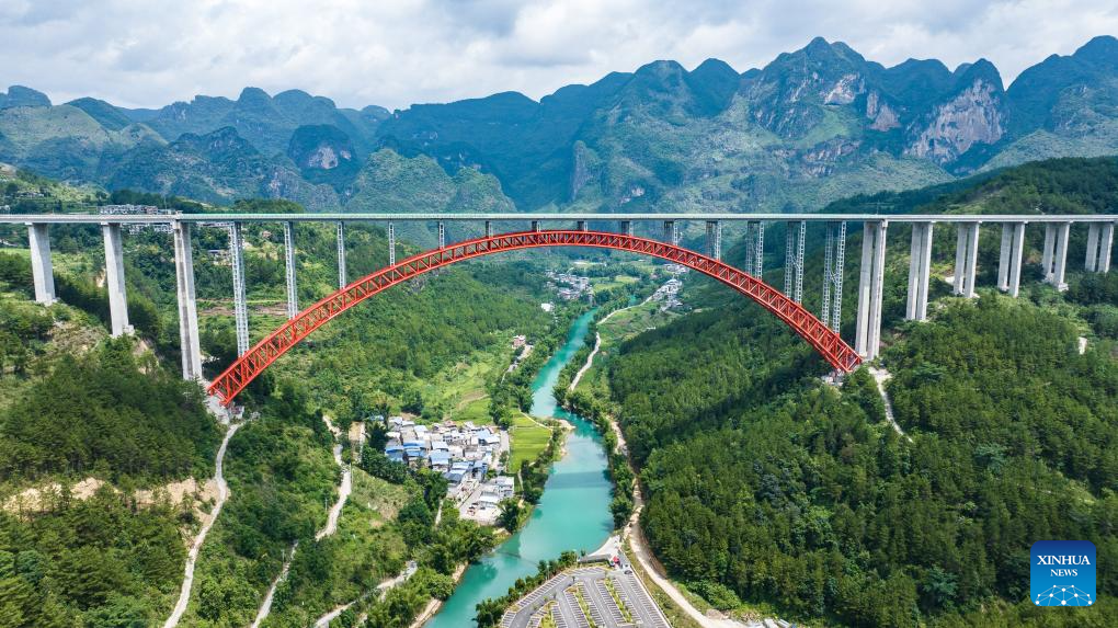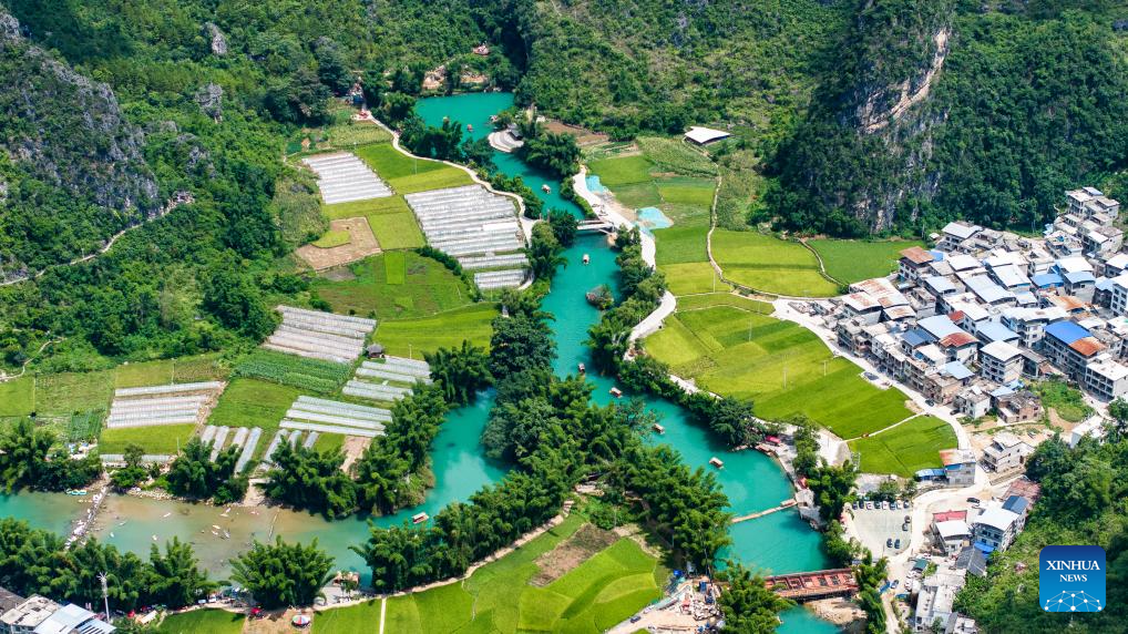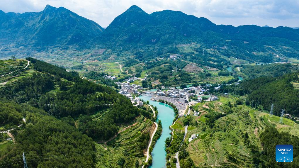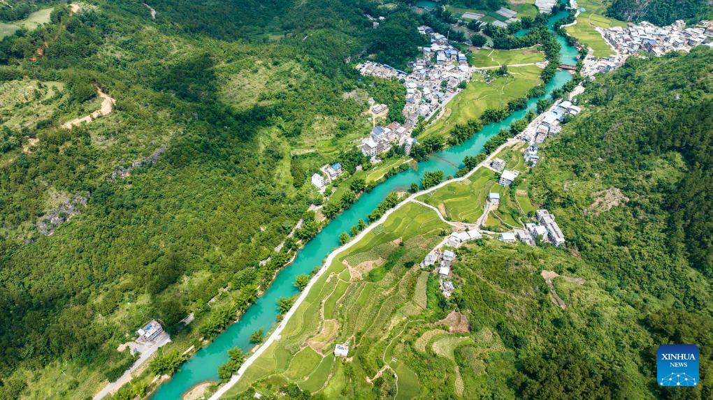 An aerial drone photo taken on Aug. 12, 2025 shows a view of the Daxiaojing scenic spot in Luodian County, southwest China's Guizhou Province. Luodian County in recent years has continuously upgraded its infrastructure and optimized its tourism service system, transforming its abundant mountain and water resources into tourist attractions. (Xinhua/Tao Liang)