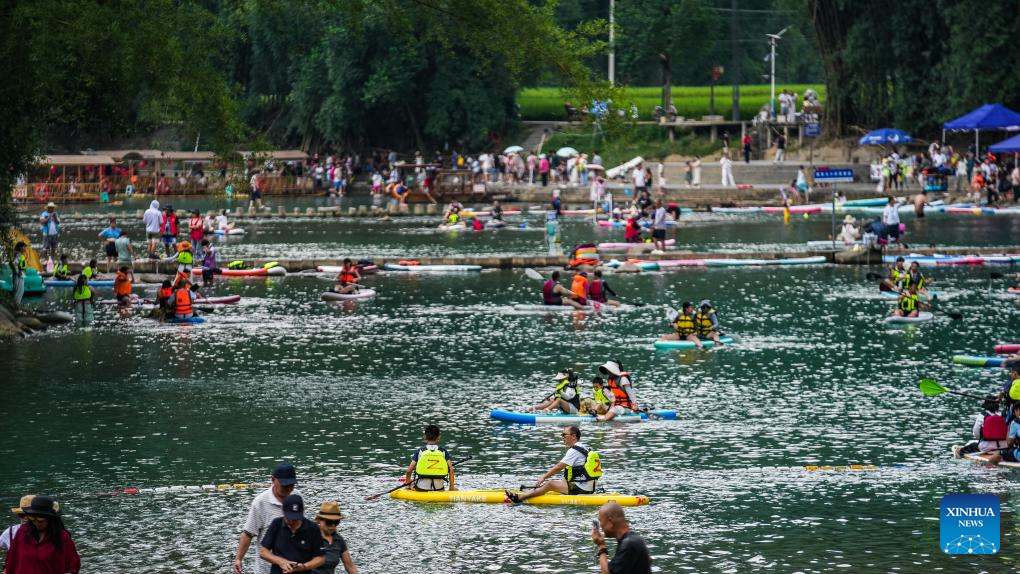 Tourists play with water at the Daxiaojing scenic spot in Luodian County, southwest China's Guizhou Province, on Aug. 12, 2025. Luodian County in recent years has continuously upgraded its infrastructure and optimized its tourism service system, transforming its abundant mountain and water resources into tourist attractions. (Xinhua/Tao Liang)