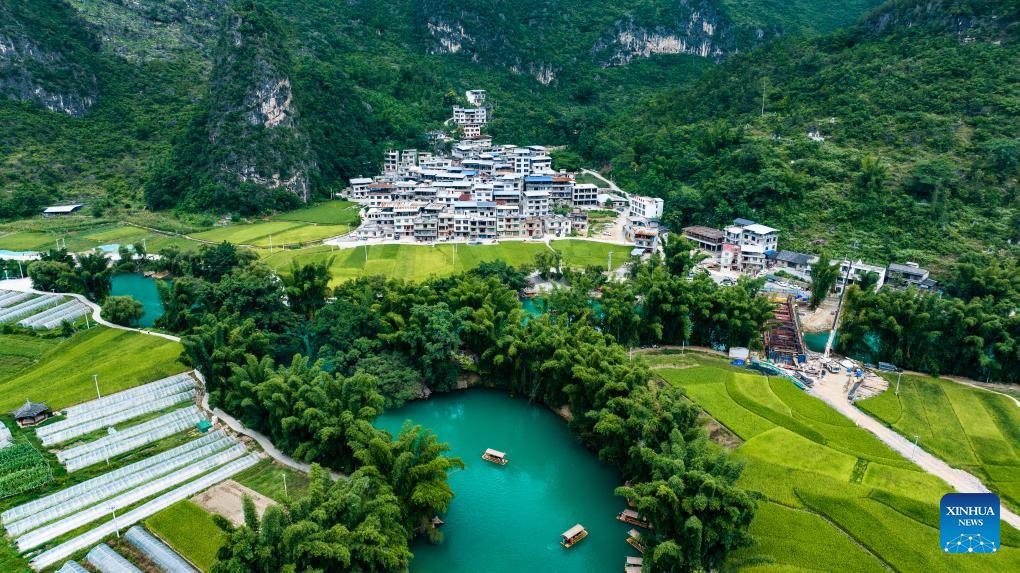 An aerial drone photo taken on Aug. 12, 2025 shows tourists taking boat tours at the Daxiaojing scenic spot in Luodian County, southwest China's Guizhou Province. Luodian County in recent years has continuously upgraded its infrastructure and optimized its tourism service system, transforming its abundant mountain and water resources into tourist attractions. (Xinhua/Tao Liang)