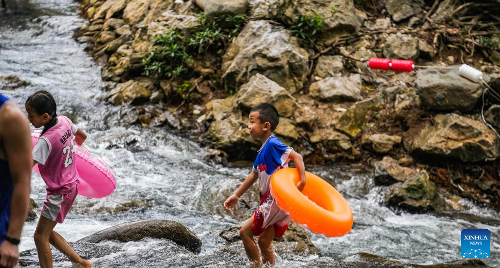 Children play with water at the Daxiaojing scenic spot in Luodian County, southwest China's Guizhou Province, on Aug. 12, 2025. Luodian County in recent years has continuously upgraded its infrastructure and optimized its tourism service system, transforming its abundant mountain and water resources into tourist attractions. (Xinhua/Tao Liang)
