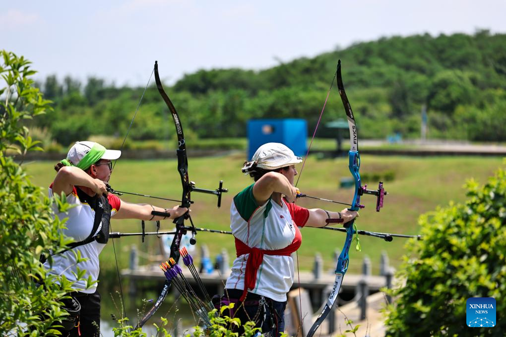 Roberta di Francesco (R) of Italy and Elisa Tartler of Germany compete during their Bronze Medal Match of the Archery Women's Recurve at The World Games 2025 in Chengdu, southwest China's Sichuan Province, Aug. 13, 2025. (Xinhua/Sun Fanyue)