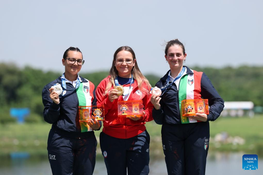 Gold medalist Denisa Barankova (C) of Slovakia, silver medalist Chiara Rebagliati (L) of Italy and bronze medalist Roberta di Francesco of Italy pose during the victory ceremony for the Archery Women's Recurve at The World Games 2025 in Chengdu, southwest China's Sichuan Province, Aug. 13, 2025. (Xinhua/Sun Fanyue)