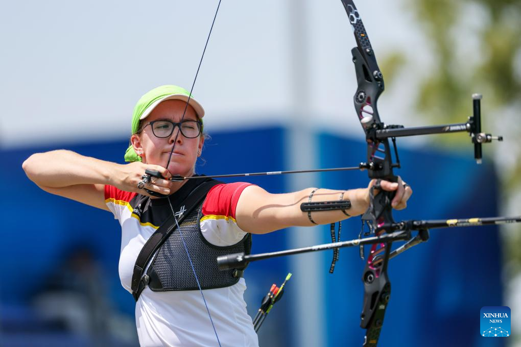 Elisa Tartler of Germany competes during the Archery Women's Recurve Bronze Medal Match against Roberta di Francesco of Italy at The World Games 2025 in Chengdu, southwest China's Sichuan Province, Aug. 13, 2025. (Xinhua/Sun Fanyue)