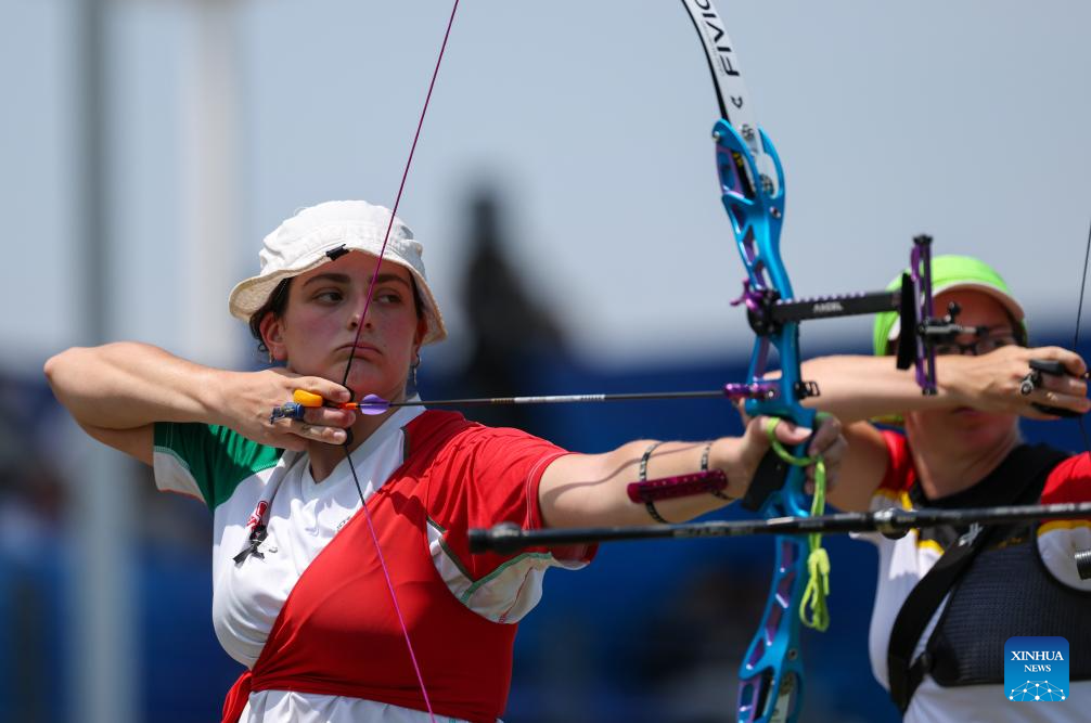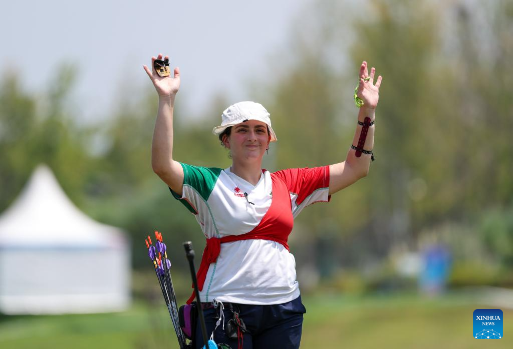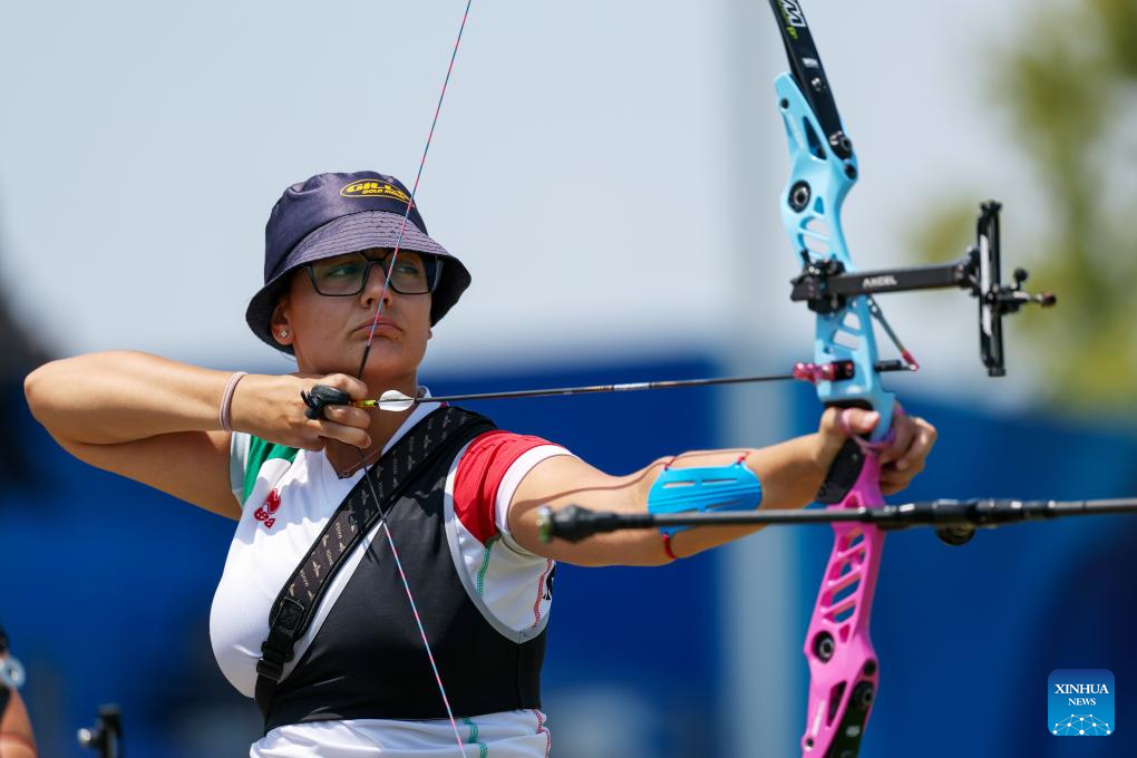 Chiara Rebagliati of Italy competes during the Archery Women's Recurve Gold Medal Match against Denisa Barankova of Slovakia at The World Games 2025 in Chengdu, southwest China's Sichuan Province, Aug. 13, 2025. (Xinhua/Sun Fanyue)