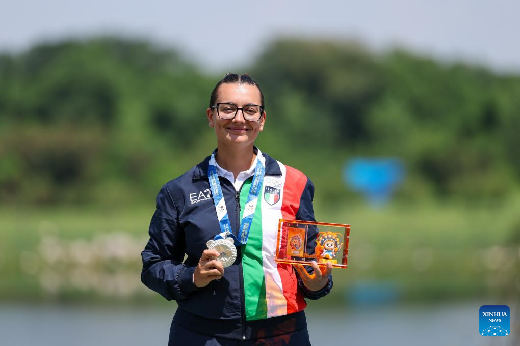 Silver medalist Chiara Rebagliati of Italy poses during the victory ceremony for the Archery Women's Recurve at The World Games 2025 in Chengdu, southwest China's Sichuan Province, Aug. 13, 2025. (Xinhua/Sun Fanyue)