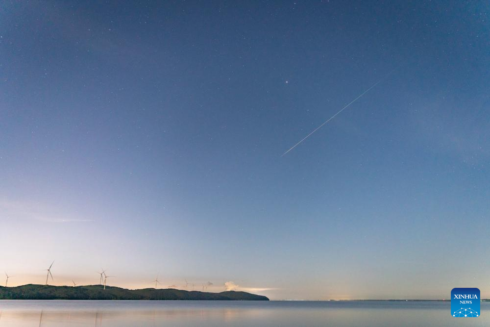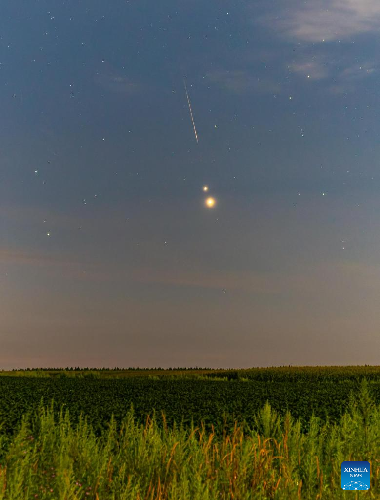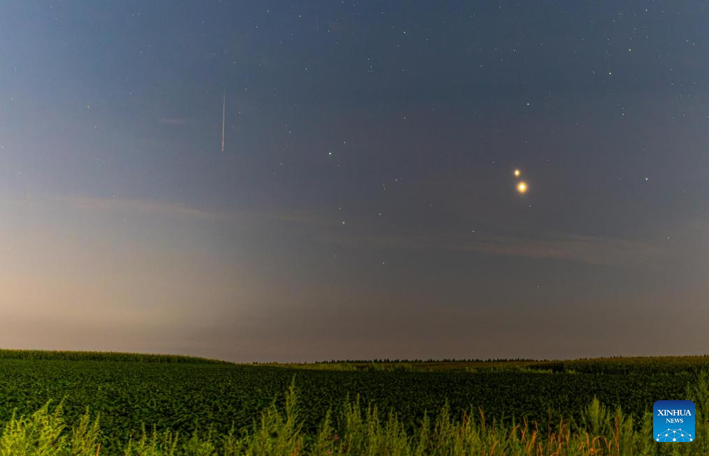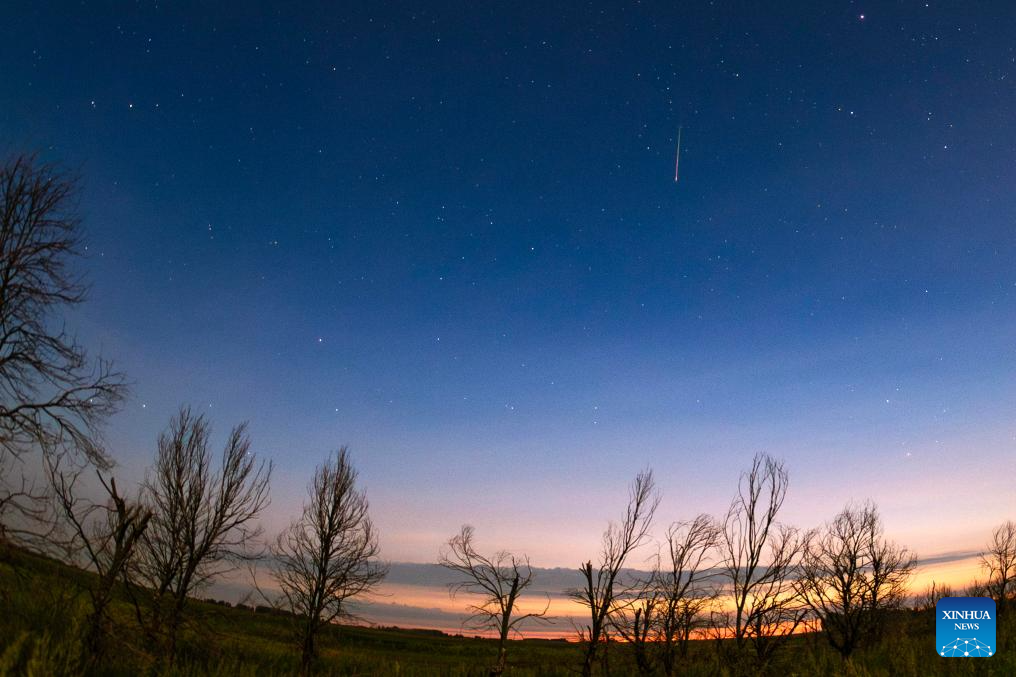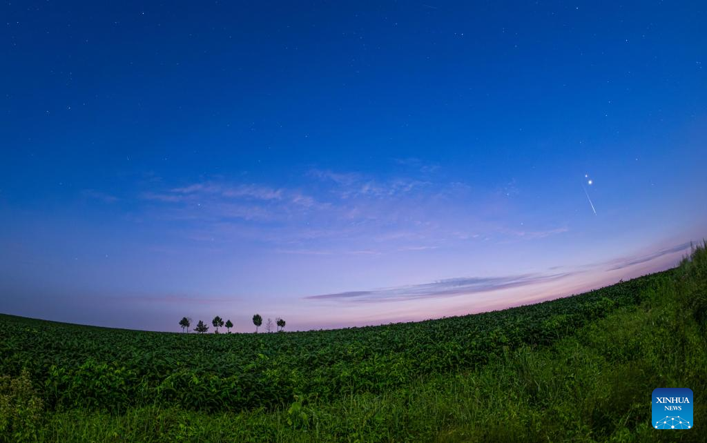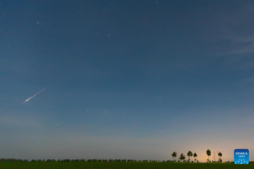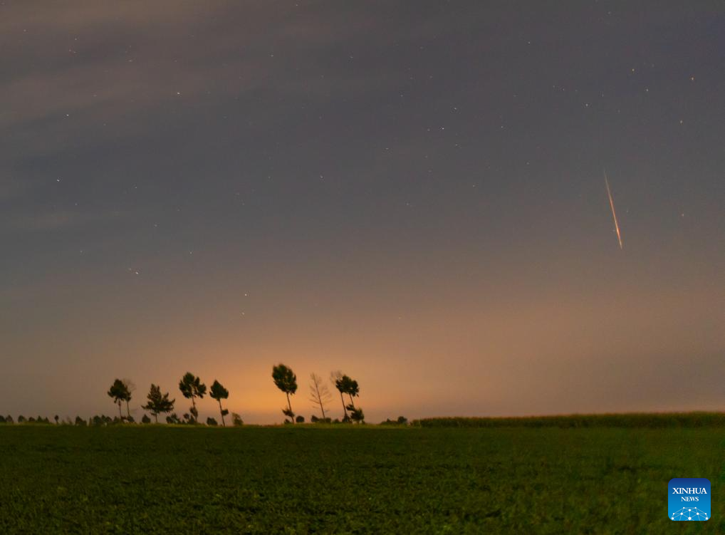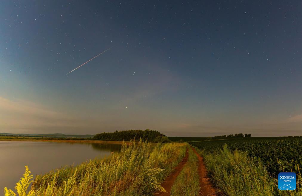 This photo taken on Aug. 13, 2025 shows Perseid meteor shower over Tangyuan County of Jiamusi City, northeast China's Heilongjiang Province. The annual Perseid meteor shower peaked on Wednesday. (Photo by Zhu Zongqiang/Xinhua)