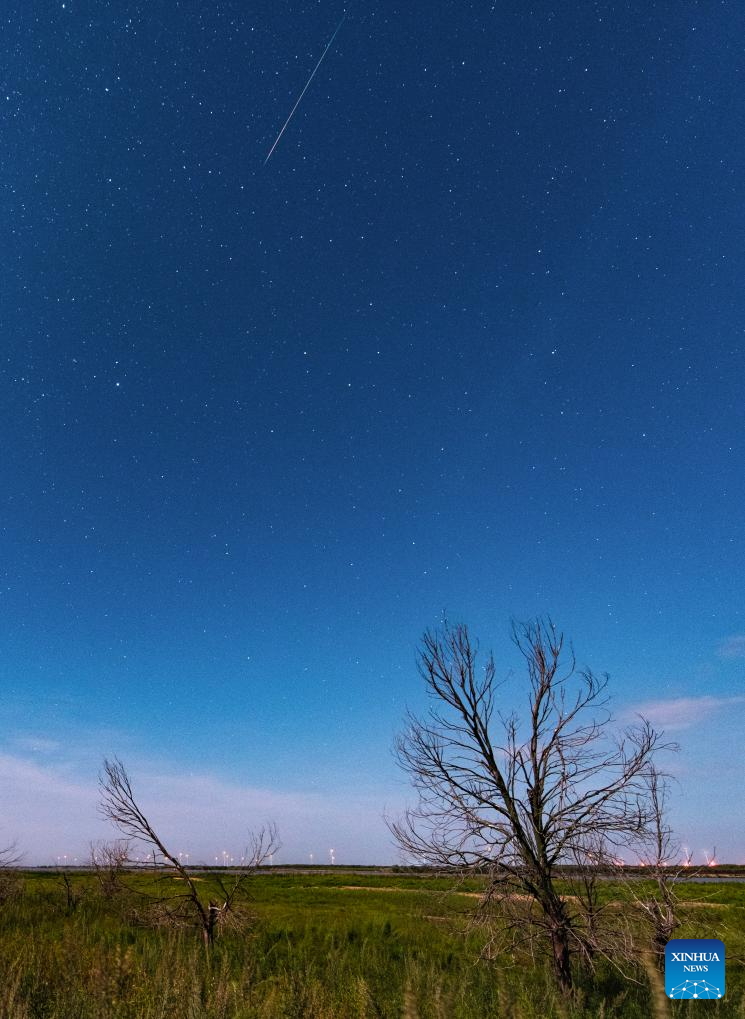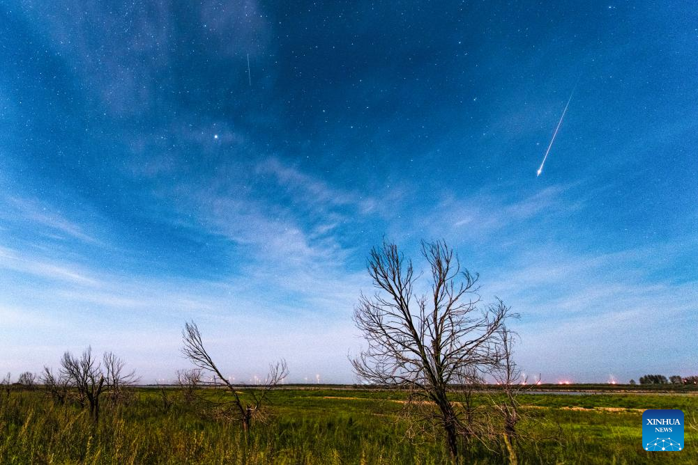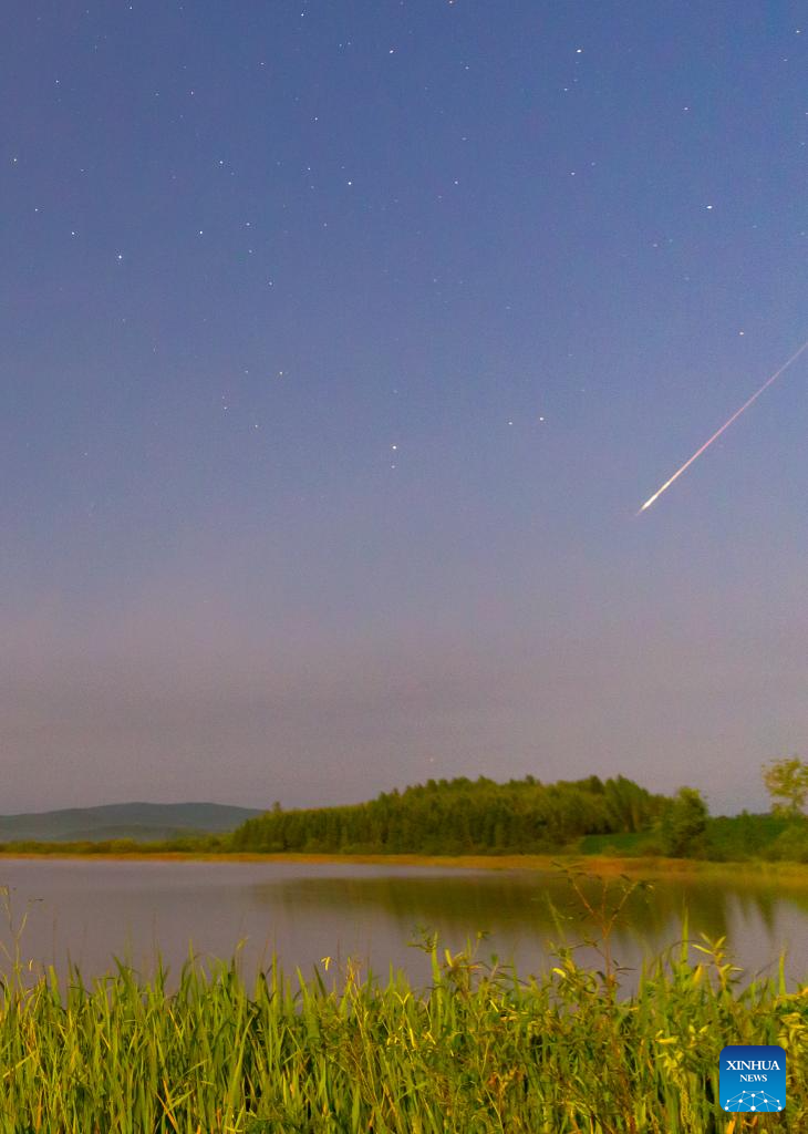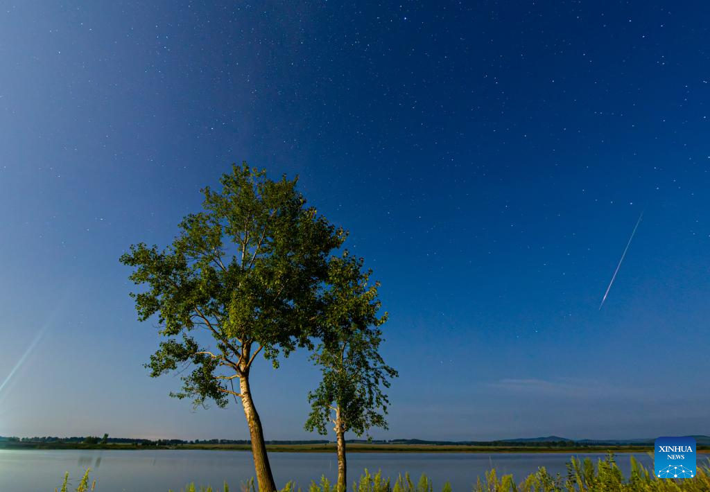 This photo taken on Aug. 11, 2025 shows Perseid meteor shower over a wetland in Harbin City, northeast China's Heilongjiang Province. The annual Perseid meteor shower peaked on Wednesday. (Photo by Liu Dapeng/Xinhua)