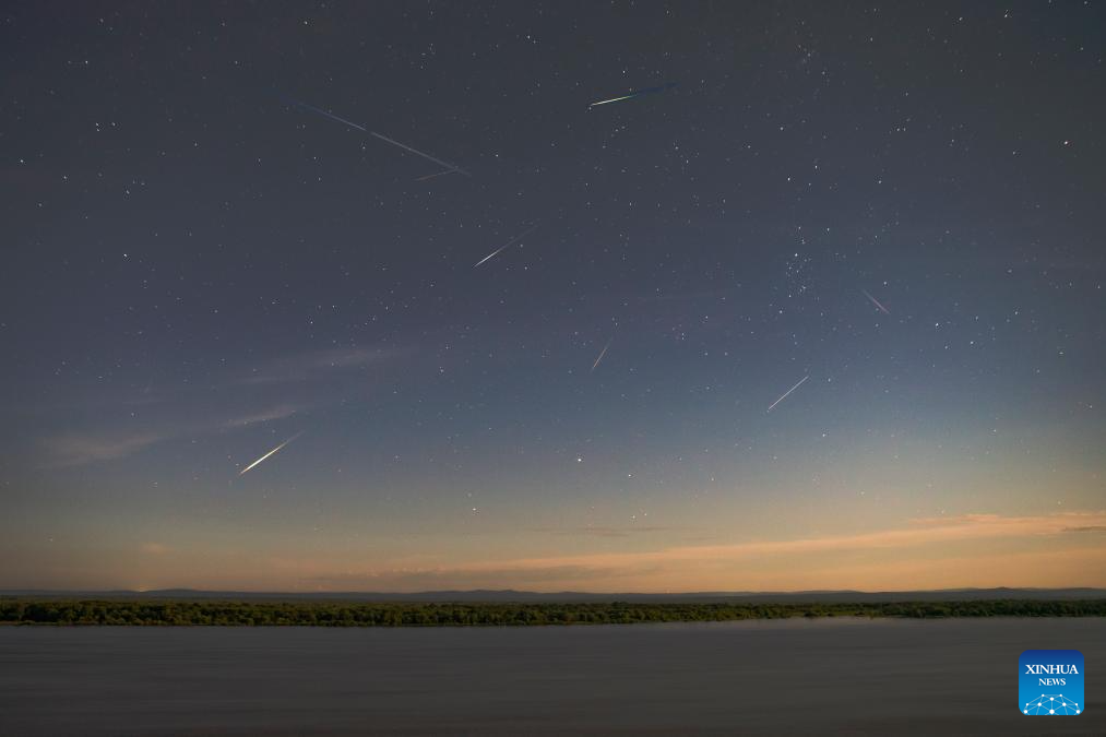 This photo taken on Aug. 13, 2025 shows Perseid meteor shower over a section of Songhua River in Fujin City, northeast China's Heilongjiang Province. The annual Perseid meteor shower peaked on Wednesday. (Photo by Qu Yubao/Xinhua)