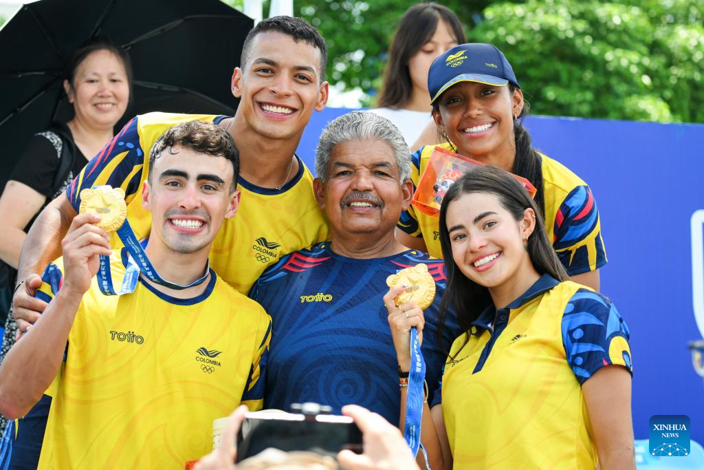 Colombian skaters Maria Fernanda Timms Ariza (top R), Rueda Gabriela (bottom R), Juan Jacobo Mantilla Pinilla (bottom L), Jhon Edwar Tascon Holguin (top L) pose after the victory ceremony for the Men's Elimination Race 15,000m of Inline Speed Skating Road event at The World Games 2025 in Chengdu, southwest China's Sichuan Province, Aug. 13, 2025. (Xinhua/Xie Jianfei)