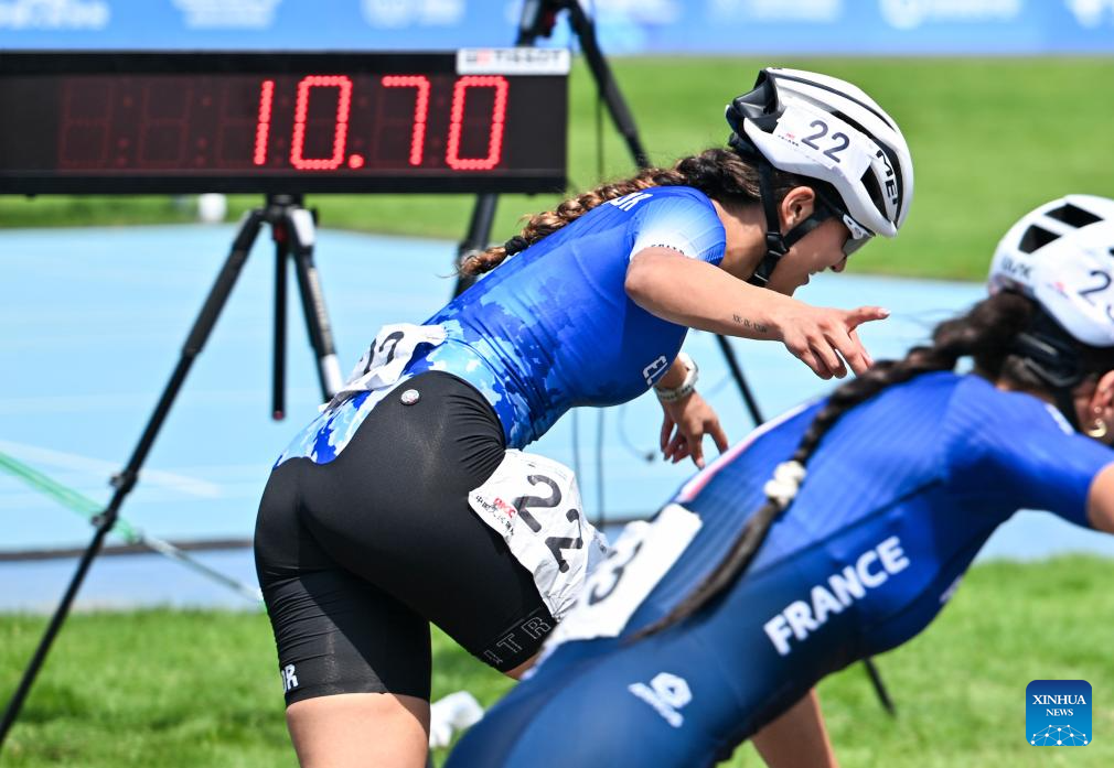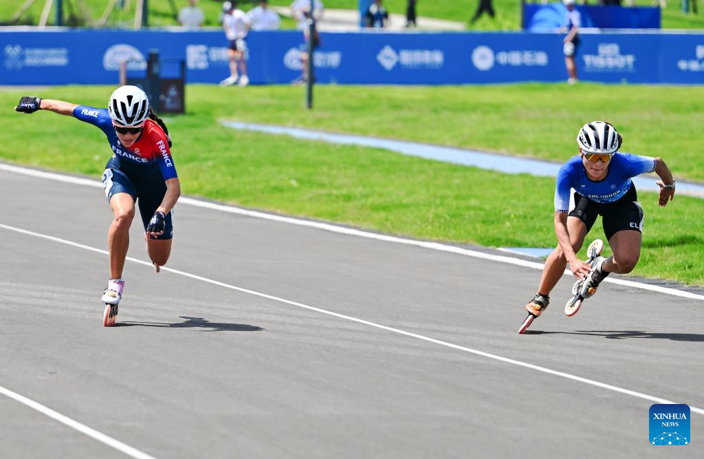 Ivonne Sarai Nochez Gallardo (R) of El Salvador and Haila Brunet Alvarez of France compete during the Women's Sprint 100m Final of Inline Speed Skating Road event at The World Games 2025 in Chengdu, southwest China's Sichuan Province, Aug. 13, 2025. (Xinhua/Xie Jianfei)