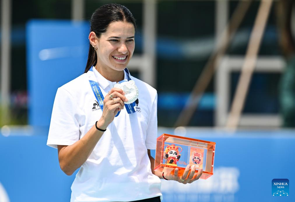 Silver medalist Haila Brunet Alvarez of France poses during the victory ceremony for the Women's Sprint 100m of Inline Speed Skating Road event at The World Games 2025 in Chengdu, southwest China's Sichuan Province, Aug. 13, 2025. (Xinhua/Xie Jianfei)