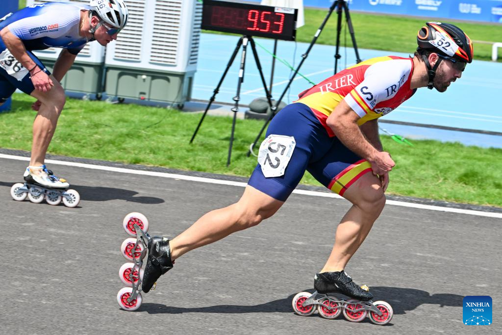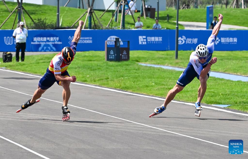 Jhoan Sebastian Guzman Bitar (L) of Spain and Vincenzo Maiorca of Italy compete during the Men's Sprint 100m Final of Inline Speed Skating Road event at The World Games 2025 in Chengdu, southwest China's Sichuan Province, Aug. 13, 2025. (Xinhua/Xie Jianfei)