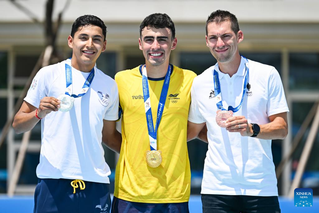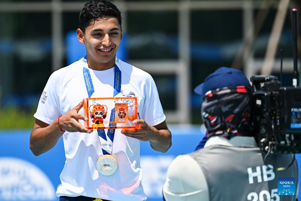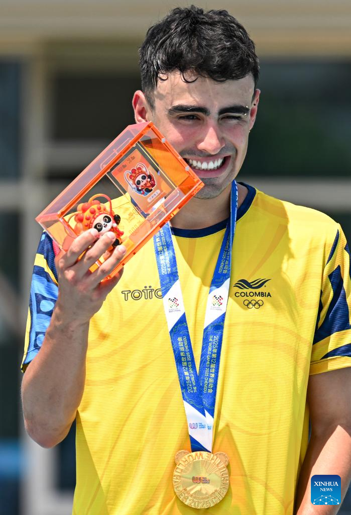 Gold medalist Juan Jacobo Mantilla Pinilla of Colombia celebrates during the victory ceremony for the Men's Elimination Race 15,000m of Inline Speed Skating Road event at The World Games 2025 in Chengdu, southwest China's Sichuan Province, Aug. 13, 2025. (Xinhua/Xie Jianfei)