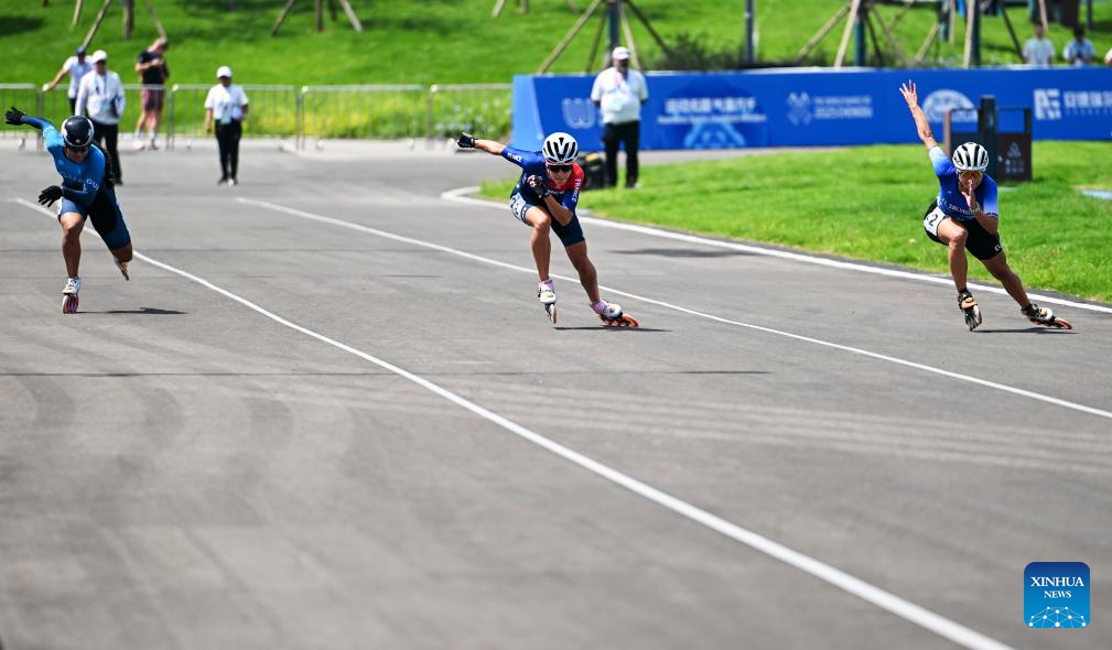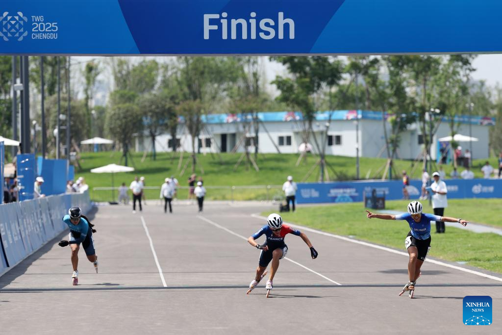 Ivonne Sarai Nochez Gallardo (R) of El Salvador, Haila Brunet Alvarez (C) of France and Dalia Soberanis (L) of Guatemala compete during the Women's Sprint 100m Final of Inline Speed Skating Road event at The World Games 2025 in Chengdu, southwest China's Sichuan Province, Aug. 13, 2025. (Xinhua/Xie Jianfei)