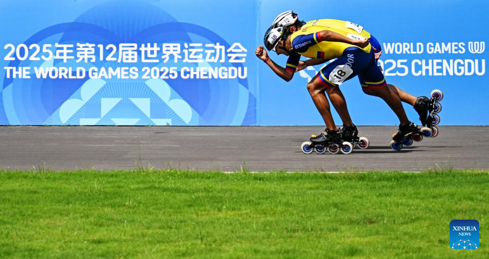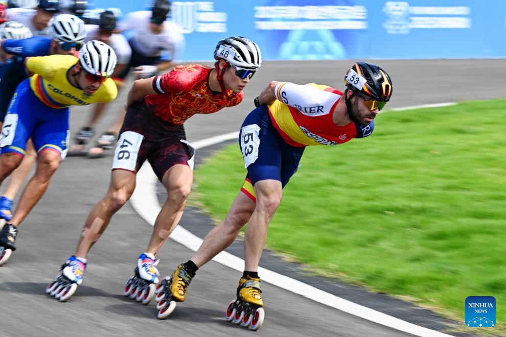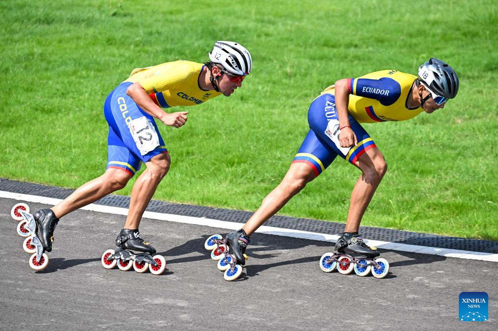 Juan Jacobo Mantilla Pinilla (L) of Colombia and Nicolas Alexander Garcia Pazmino of Ecuador compete during the Men's Elimination Race 15,000m Final of Inline Speed Skating Road event at The World Games 2025 in Chengdu, southwest China's Sichuan Province, Aug. 13, 2025. (Xinhua/Xie Jianfei)
