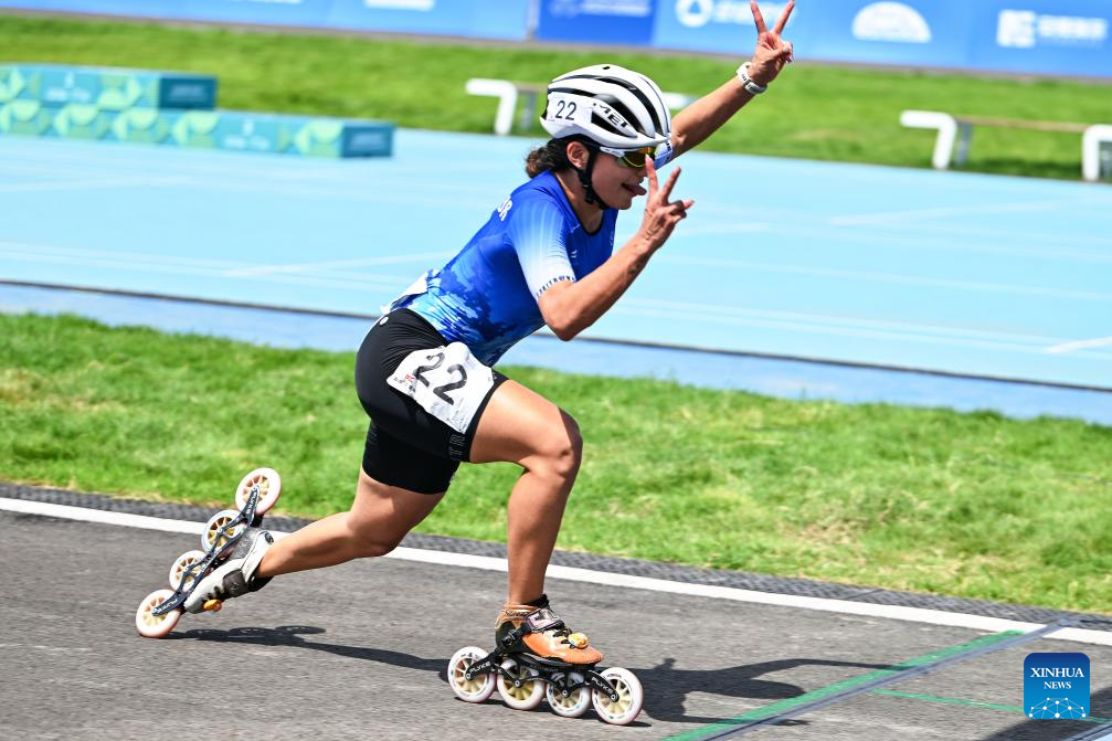 Ivonne Sarai Nochez Gallardo of El Salvador reacts as she crosses the finish line during the Women's Sprint 100m Final of Inline Speed Skating Road event at The World Games 2025 in Chengdu, southwest China's Sichuan Province, Aug. 13, 2025. (Xinhua/Xie Jianfei)