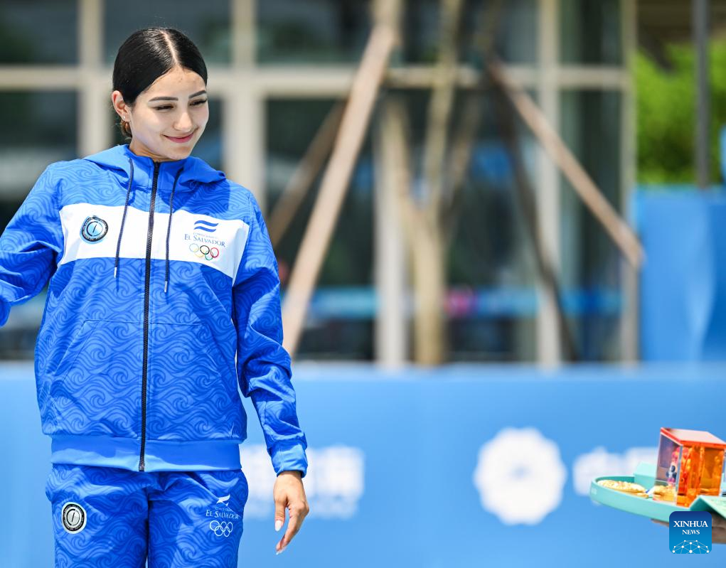 Gold medalist Ivonne Sarai Nochez Gallardo of El Salvador watches her awards during the victory ceremony for the Women's Sprint 100m of Inline Speed Skating Road event at The World Games 2025 in Chengdu, southwest China's Sichuan Province, Aug. 13, 2025. (Xinhua/Xie Jianfei)