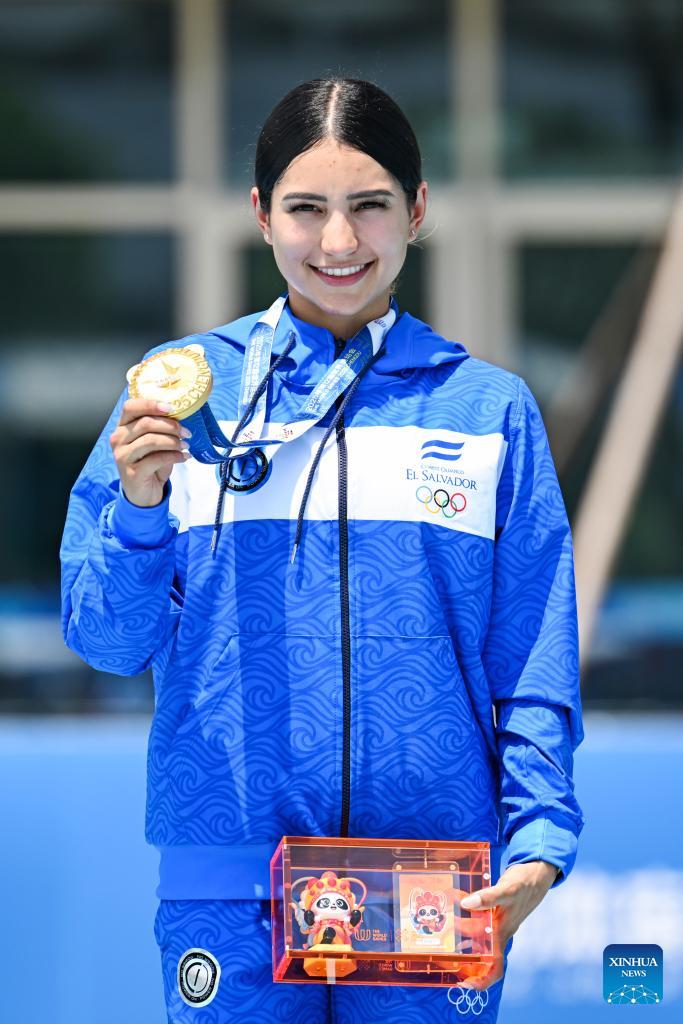Gold medalist Ivonne Sarai Nochez Gallardo of El Salvador poses during the victory ceremony for the Women's Sprint 100m of Inline Speed Skating Road event at The World Games 2025 in Chengdu, southwest China's Sichuan Province, Aug. 13, 2025. (Xinhua/Xie Jianfei)