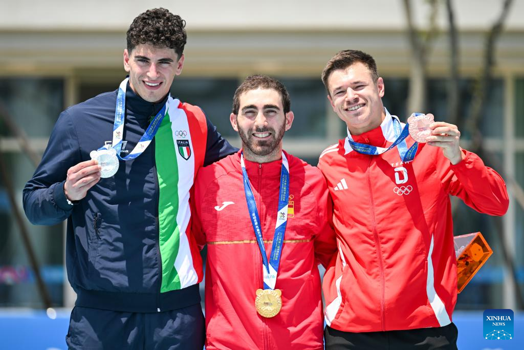 Gold medalist Jhoan Sebastian Guzman Bitar (C) of Spain, silver medalist Vincenzo Maiorca (L) of Italy and bronze medalist Ron Pucklitzsch of Germany pose during the victory ceremony for the Men's Sprint 100m of Inline Speed Skating Road event at The World Games 2025 in Chengdu, southwest China's Sichuan Province, Aug. 13, 2025. (Xinhua/Xie Jianfei)