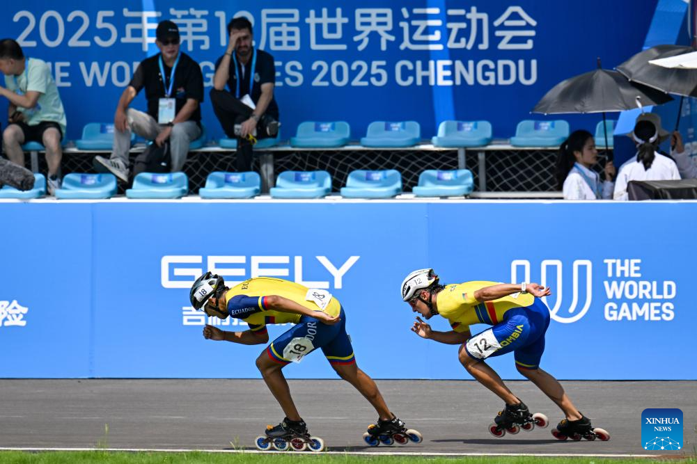 Juan Jacobo Mantilla Pinilla (R) of Colombia and Nicolas Alexander Garcia Pazmino of Ecuador compete during the Men's Elimination Race 15,000m Final of Inline Speed Skating Road event at The World Games 2025 in Chengdu, southwest China's Sichuan Province, Aug. 13, 2025. (Xinhua/Xie Jianfei)