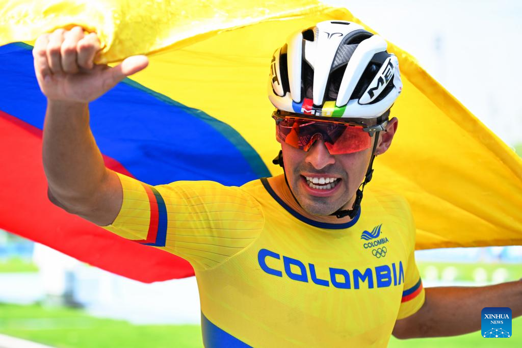 Juan Jacobo Mantilla Pinilla of Colombia celebrates after winning the Men's Elimination Race 15,000m Final of Inline Speed Skating Road event at The World Games 2025 in Chengdu, southwest China's Sichuan Province, Aug. 13, 2025. (Xinhua/Xie Jianfei)