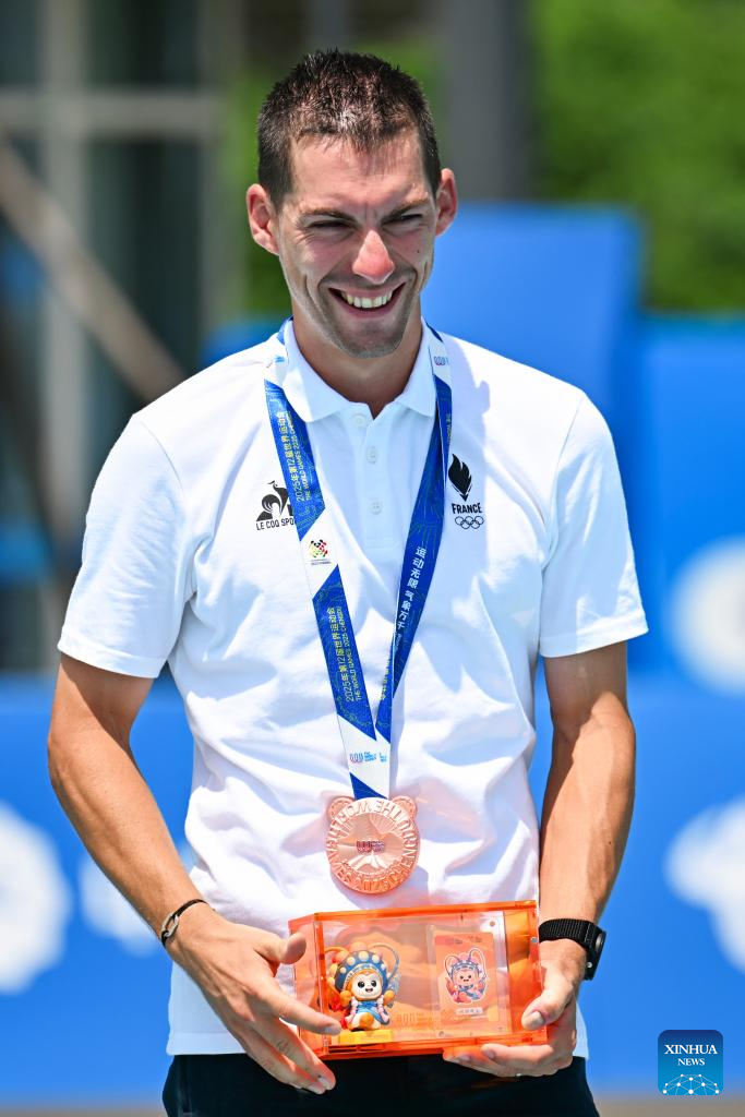 Bronze medalist Martin Ferrie of France celebrates during the victory ceremony for the Men's Elimination Race 15,000m of Inline Speed Skating Road event at The World Games 2025 in Chengdu, southwest China's Sichuan Province, Aug. 13, 2025. (Xinhua/Xie Jianfei)